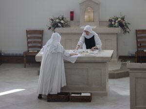 A dedication is particularly significant for a monastic community, as the Oratory forms the heart of the monastery where they gather seven times a day to pray the Divine Office, daily to celebrate the Sacrifice of the Mass, and throughout the day to seek Our Lord’s Eucharistic Presence. The rite also recalls each nun’s consecration to God when she became a bride of Christ, enfleshing the bridal identity of the entire Church, a living temple of God’s presence in the world.  It also a place of vigil, waiting for the complete fulfillment of all our hope, trusting that He who began the work of building this place will fulfill it further in the New Jerusalem.