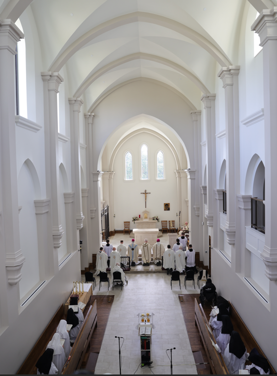 In March of 2024, the Cistercian nuns of Valley of Our Lady Monastery, twenty-one in all, moved into a newly-built monastery in Hollandale, Wisconsin, about one hour south of their old location.  The new monastery is situated in a place of greater solitude and space, enabling the sisters to better live out their particular charism in the Church—that of cloistered monastic life according to the Rule of St Benedict.  The final phase of building was completed some months after moving in, and August 24th, 2025, witnessed the final crowning of the project: the consecration and dedication of the monastery’s Oratory.  The rite was performed by Bishop Donald Hying, with several others concelebrating.  The guest nave of the oratory was full to overflowing with friends new and old of the community.